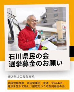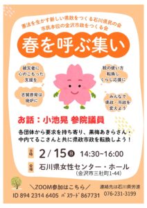 春を呼ぶ新春の集い 2026年2月10日 最終更新日時 : 2026年2月10日 ishi.kenmin@gmail.com 20260215憲法を生かす新しい県政をつくる石川県民の会市民の会合同ダウンロード 共有: Facebook で共有 (新しいウィンドウで開きます) Facebook X で共有 (新しいウィンドウで開きます) X Threads で共有 (新しいウィンドウで開きます) Threads いいね:いいね 読み込み中…FacebookXCopy