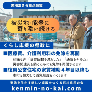 - 打ち切られた被災者の医療費・介護利用料免除を再開します。